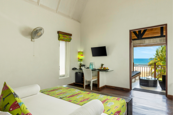 Inside, you’ll find a well-appointed bedroom, a comfortable seating area, and a dining space. The suite is equipped with a flat-screen TV with cable channels, a minibar, and tea and coffee making facilities for your convenience. The modern bathroom boasts a walk-in shower and a relaxing bathtub, providing the perfect spot to unwind. With stunning sea views and luxurious amenities, this suite offers a truly memorable seaside escape.